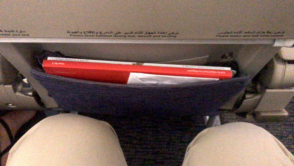 Herover: Læsestoffet i stolelommen består af “Gulf Life” inflightmagasinet, Duty Free kataloget samt kortet med flyets sikkerhedsinstruktioner