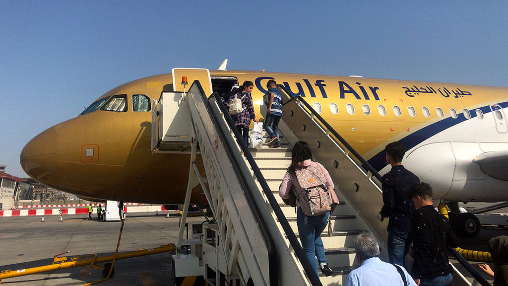 Der er afgang fra Manama i Bahrain klokken 9 om morgenen. Der er lange køer ved check-in, men heldigvis er det muligt at lave self-service check-in og gå til “bag drop” køen. Det sparer en masse tid i lufthavnen.