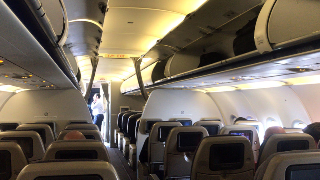 Indretningen af kabinen på flyet rummer ikke de store overraskelser. Forrest er der fire rækker “Falcon Gold” med to store sæder på hver side af midtergangen. Herefter starter Economy Class med tre sæder i hver side af flyet.