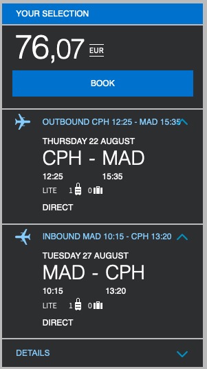 Det giver en totalpris på EUR 76,07 for en returbillet med Air Europa. Bemærk at en kuffert, der skal checkes ind, koster ekstra, ligesom der også er gebyr sædereservation samt betaling for forplejning ombord på ruten København-Madrid.