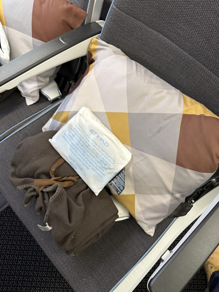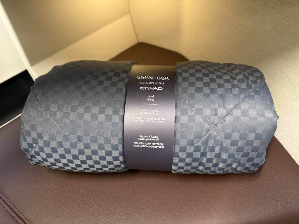 Og så ligger her et stort, behageligt tæppe fra Armani/Casa, som man kan tage over sig, hvis man vil have et par timers søvn undervejs.